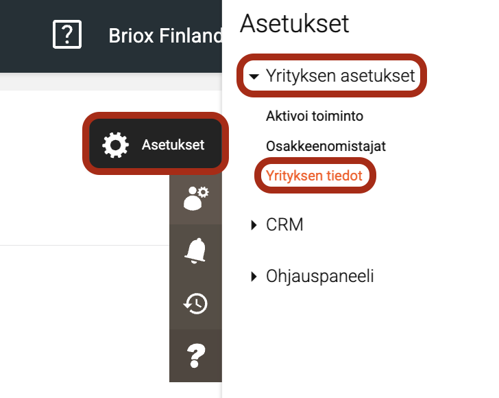 Jos yhdistys tai muu organisaatio ei ole ALV-rekisteröity, merkitse tämä kohdassa Yrityksen asetukset → Yrityksen tiedot. Löydät Asetukset oikeanpuoleisesta valikosta. Katso alta.