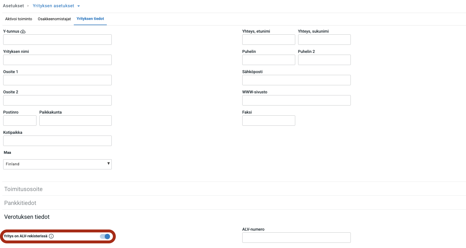 Jos yritys myöhemmin rekisteröityy ALV-velvolliseksi, päivitä asetus ja tallenna. Tämän jälkeen sinun tulee myös syöttää yrityksen ALV-numero, jotta ALV-raportti tulee näkyviin ja käyttöön.