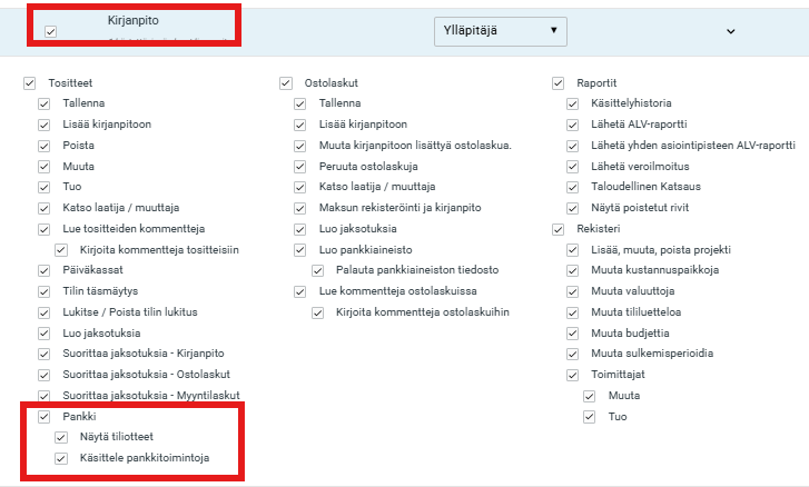Jos työskentelet viitemaksujen kanssa Pankki-osiossa, et tarvitse erillisiä käyttöoikeuksia nähdäksesi viitemaksuja. Samat oikeudet kattavat sekä tiliotteet että saapuvat viitemaksut.