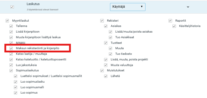 Jos taas käsittelet viitemaksuja Laskutus-osion kautta, riittää että sinulla on oikeudet rekisteröidä ja kirjata maksuja.