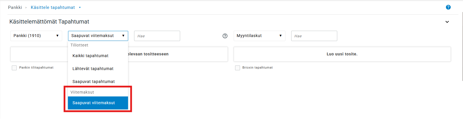 Napsauta alasvetovalikkoa ja valitse Saapuvat viitemaksut, jotta näet ne kohdassa Pankki > Käsittele tapahtumia (katso kuva).