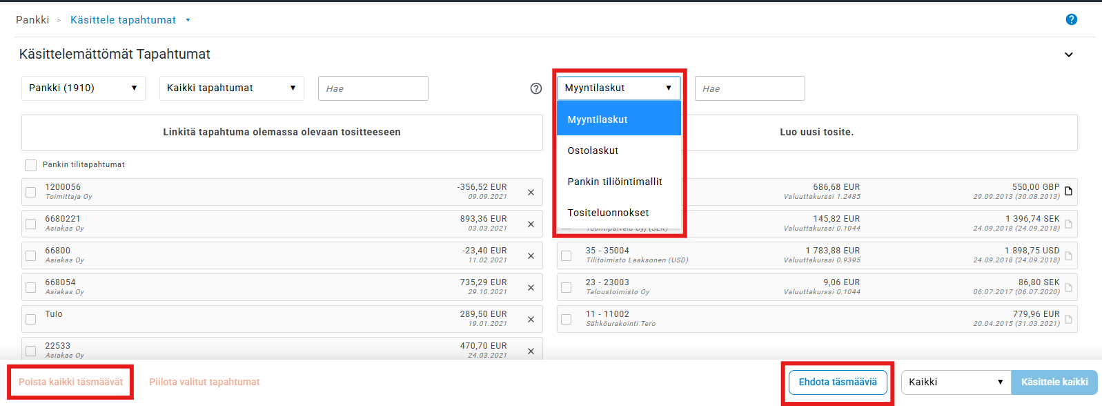 Jos et käytä automaattista täsmäytystä tuonnin yhteydessä, voit pyytää Brioxia etsimään täsmäytyksiä näkymässä Käsittele tapahtumia.