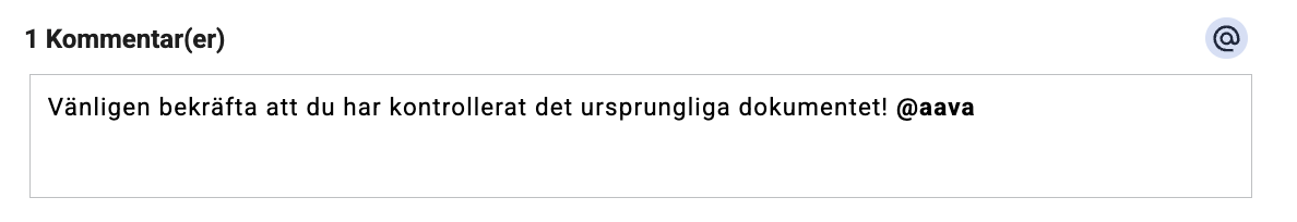 Skicka dina kommentarer direkt till dina kollegor eller kunder genom att nämna dem med @ i kommentarsfältet. Skriv symbolen direkt i inmatningsfältet eller klicka på den för att få en lista över alla behöriga användare. Samma kommentar kan skickas till flera användare.