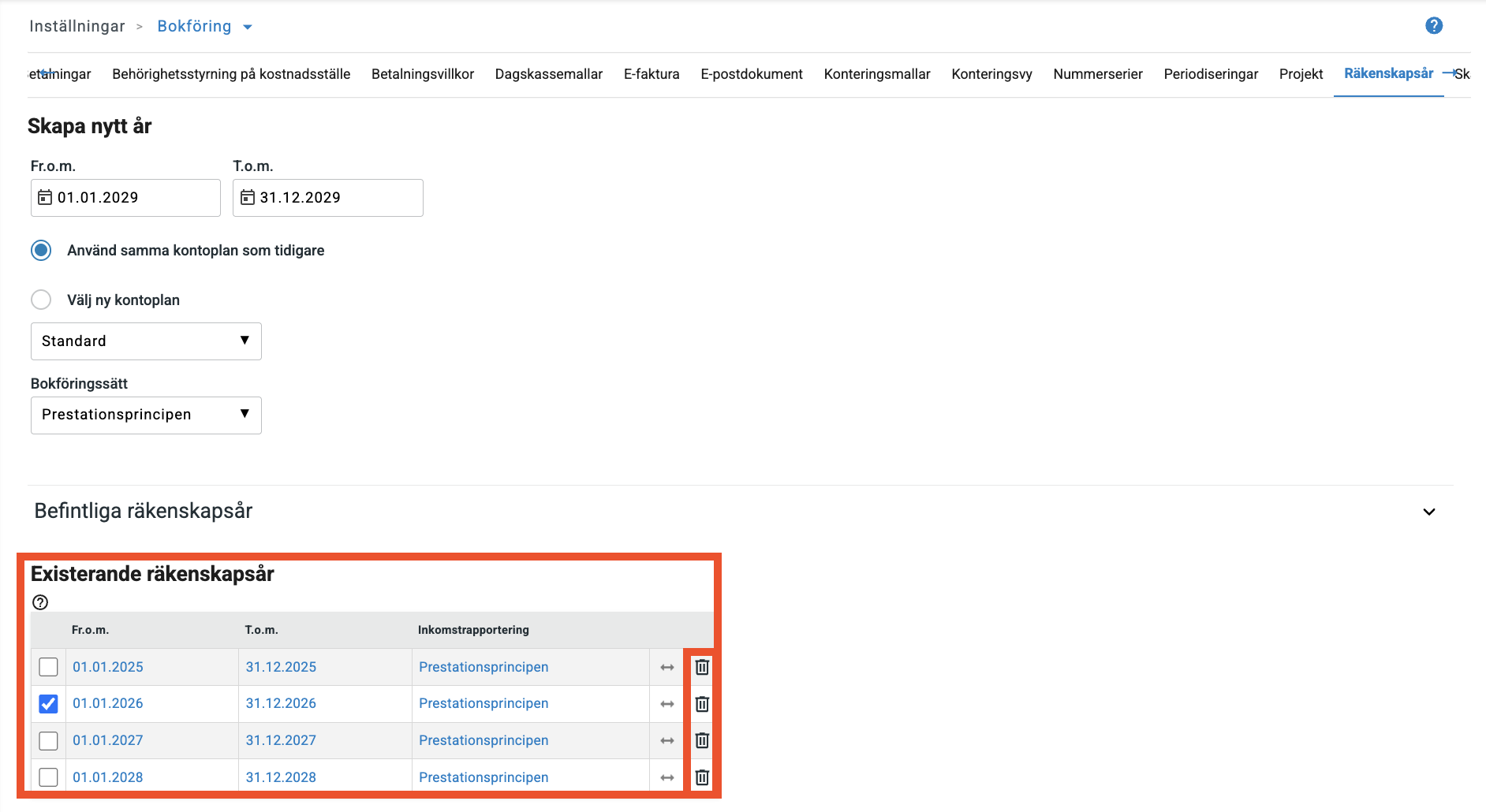Obs: du kan endast radera ett räkenskapsår som du ännu inte har bokfört på.