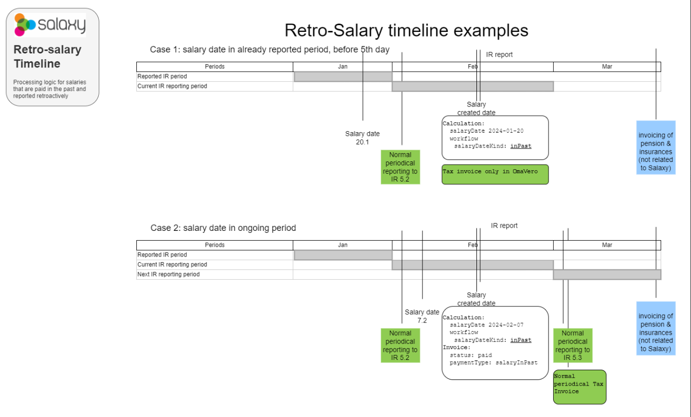 - För retroaktiv lön i samma period, februari (7.2): Rapporteringen till inkomstregistret görs för perioden månaden efter (rapporteringen till inkomstregistret görs i mars: 5.03).