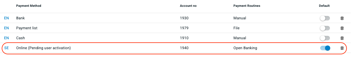 Betalningsmetoden förblir i väntan på aktivering tills användaren har kopplat sitt bankkonto: