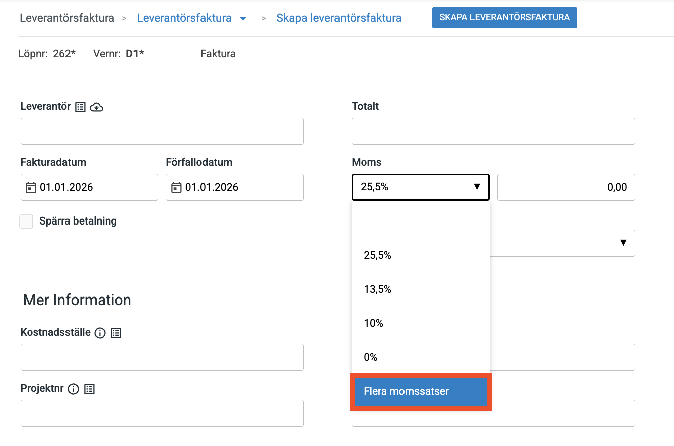I båda fallen måste du välja alternativet Flera momssatser i moms-rullgardinsmenyn i fakturahuvudet.