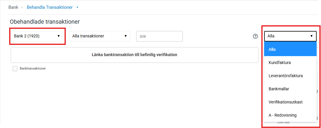Banktransaktioner hanteras under Bank – Behandla transaktioner. Välj först betalningsmetod i vänsterkanten och därefter vad transaktionerna ska matchas mot via rullgardinsmenyn till höger.