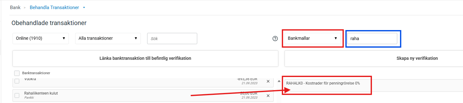 Transaktioner som matchats med konteringsmall visas i Matchade transaktioner med hänvisning till mallens namn.