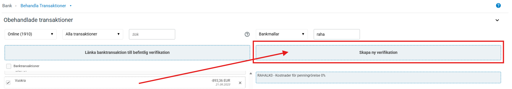Om en bankhändelse inte kan matchas kan du dra den till fältet Skapa nytt verifikat och kontera den manuellt i bokföringsvyn.