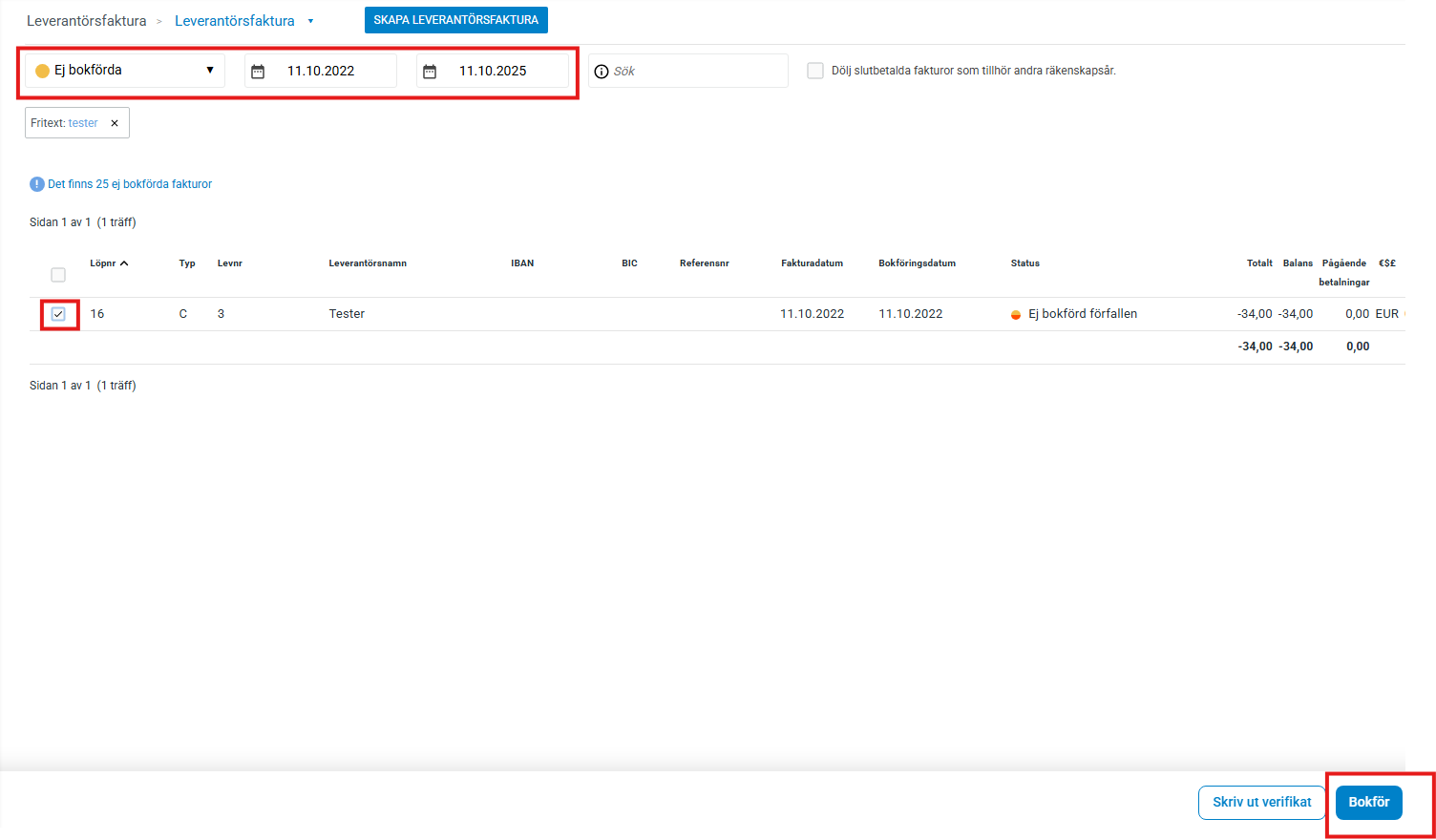 När listan är tom kan du gå vidare och kontrollera att alla leverantörsfakturor är bokförda.