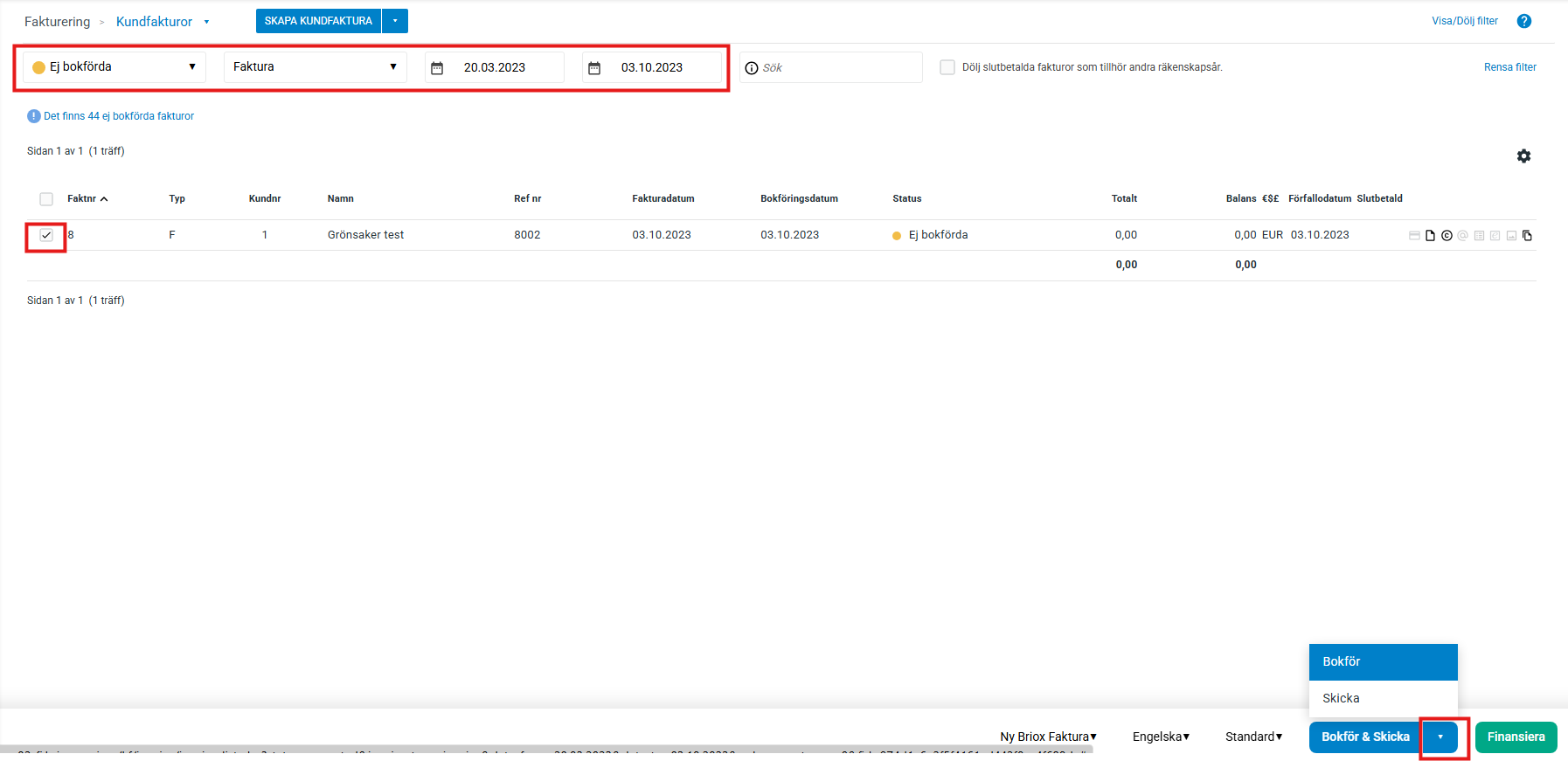 Under Fakturering – Kundfakturor kan du filtrera på status Ej bokförd samt periodens slutdatum.