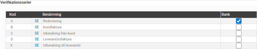 För att detta ska vara möjligt går du till Inställningar – Bokföring – Verifikationsserier och markerar i kolumnen Bank de verifikattyper som används för kundens kvitton.