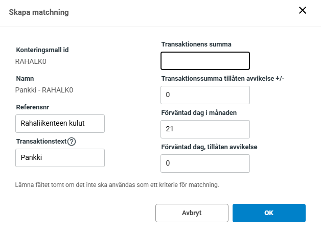 Av dessa måste minst ett kriterium användas. För datum och belopp kan avvikelse tillåtas.