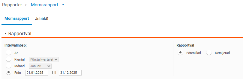 När du öppnar Momsrapport-verktyget väljer du först den period som du vill skapa rapporten för. Programmet visar som standard en enkel version med totalsummor per momskod.