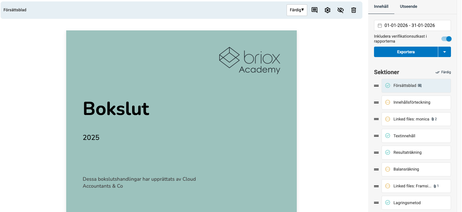 Den nya rapportgeneratorn ger förbättrad layout och formatering för alla rapporter som ingår i den sammanställda PDF-filen. Rubriker, mellanrum, justeringar och övergripande struktur hanteras mer konsekvent, vilket ger en tydligare och mer professionell presentation. Detta säkerställer att sammanslagna rapporter följer en enhetlig layout, vilket gör den slutliga PDF-filen lättare att läsa och bättre lämpad för extern distribution.Liveförhandsgranskning och omedelbara uppdateringar