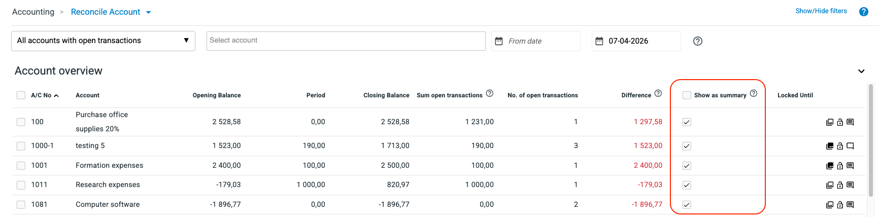 För att andra konton ska summeras på samma sätt, välj kontona i kontoöversiktsdelen av Avstämningsvyn.