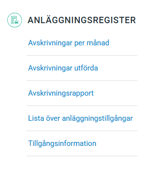 Anläggningsregistret kommer med sitt eget urval av rapporter som du hittar under Rapporter - Rapporter - Anläggningsregister.