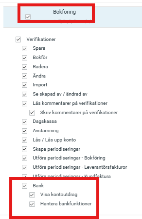 Under Admin - Användare - (välj en användare) kan du ange användarinställningar för online banktjänster genom att bocka i kryssrutan Bank (under Bokföring - se bild nedan).
